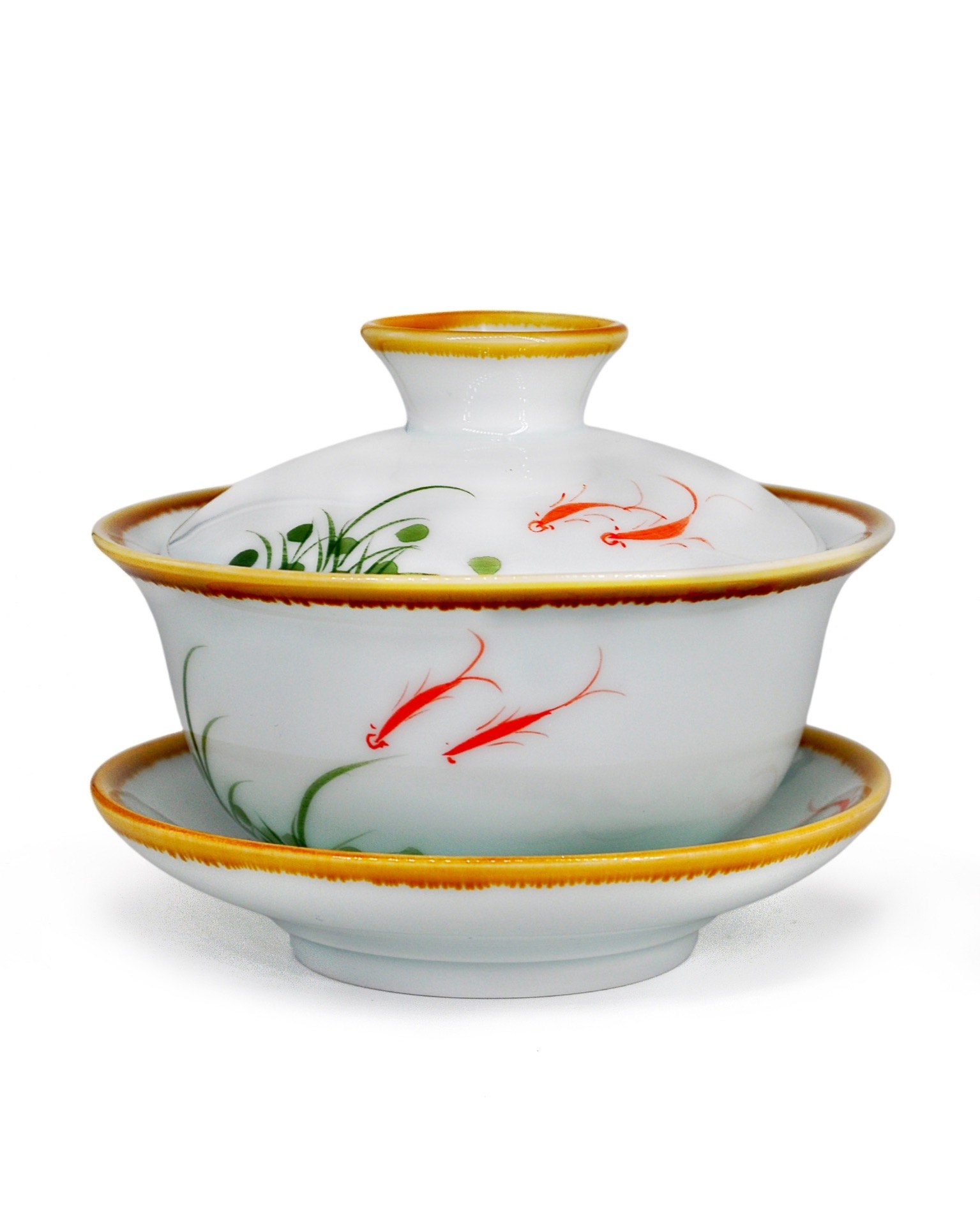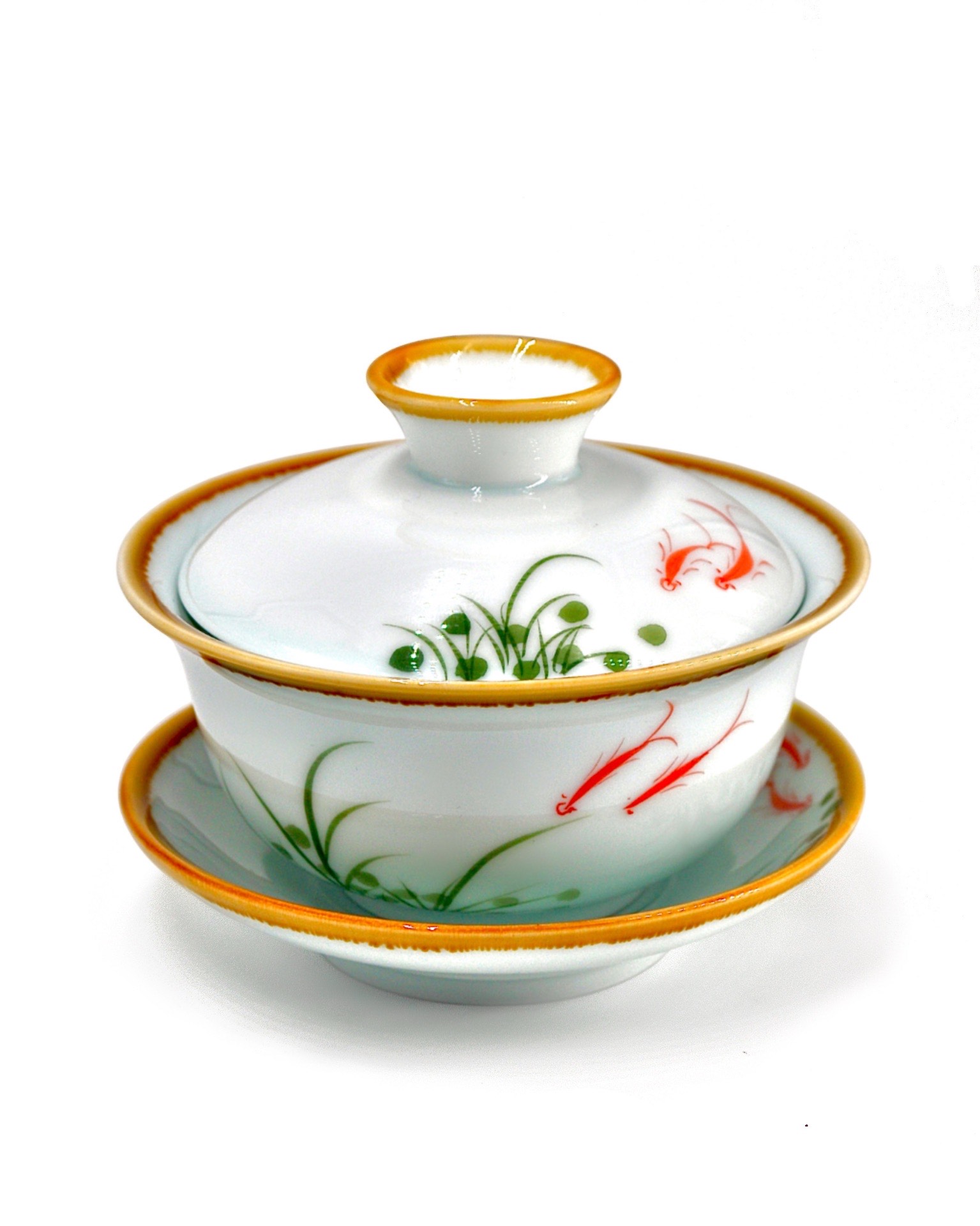 Гайвань с изображениями золотых рыбок и лотосов. Символ золотых рыбок означает процветание, изобилие и удачу. Лотос – священный цветок в Китае. Лотос обычно растет в мутной воде, но его цветок остается чистым и незапятнанным, что делает его идеальным символом духовной чистоты и нравственной стойкости.